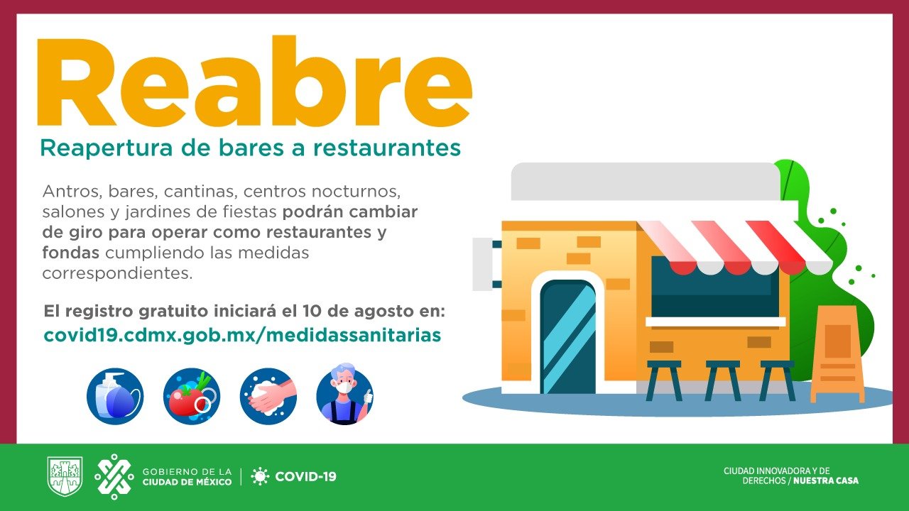 Se informó que podrán cambiar de giro por medio de su registro en el programa de Gobierno. Este trámite no tendrá costo alguno y que se podrá realizar en línea. El negocio deberá cumplir con todas las medidas sanitarias establecidas y registrarse en la página covid19.cdmx.gob.mx/medidassanitarias, a partir de este próximo 10 de agosto.